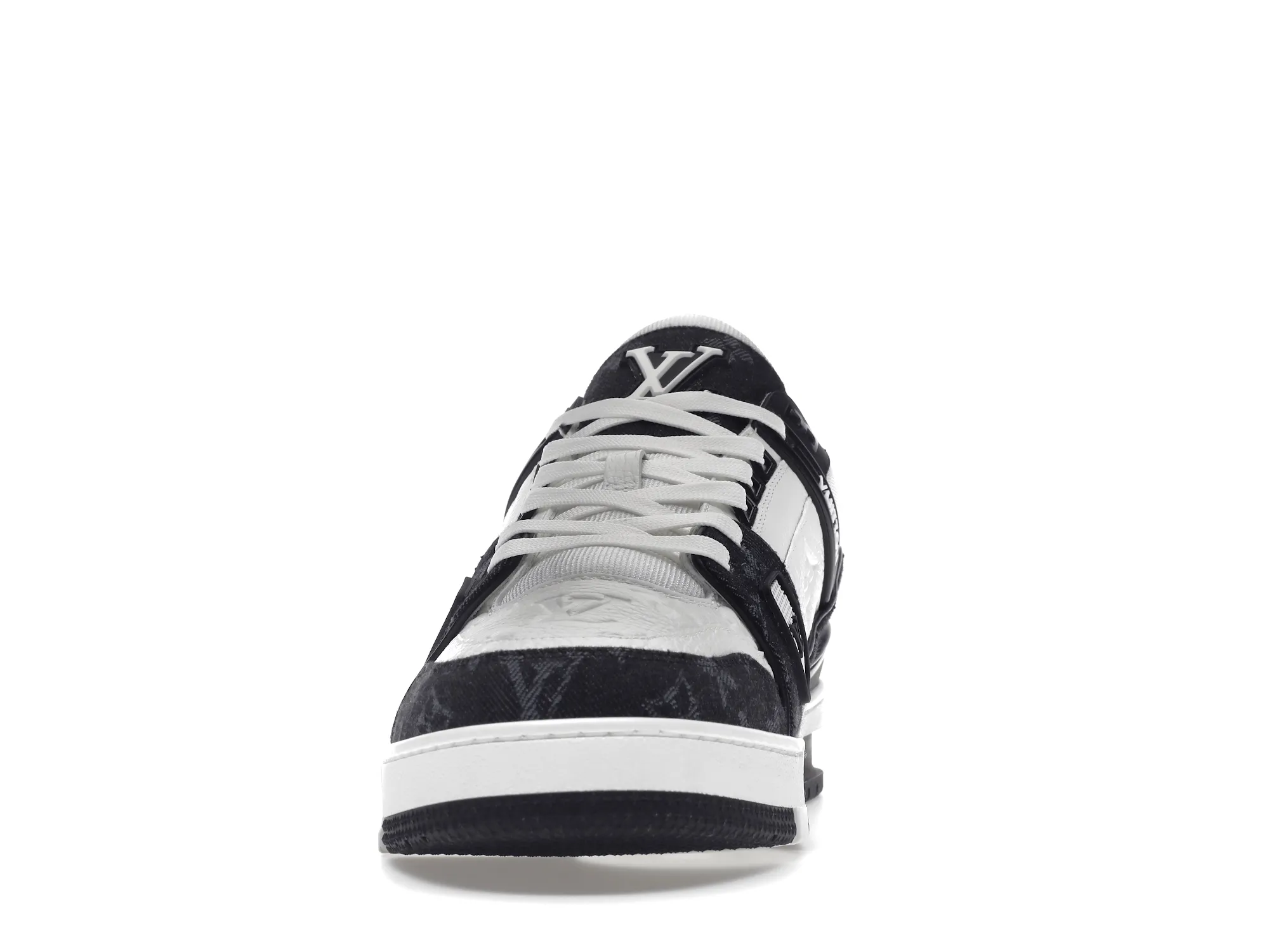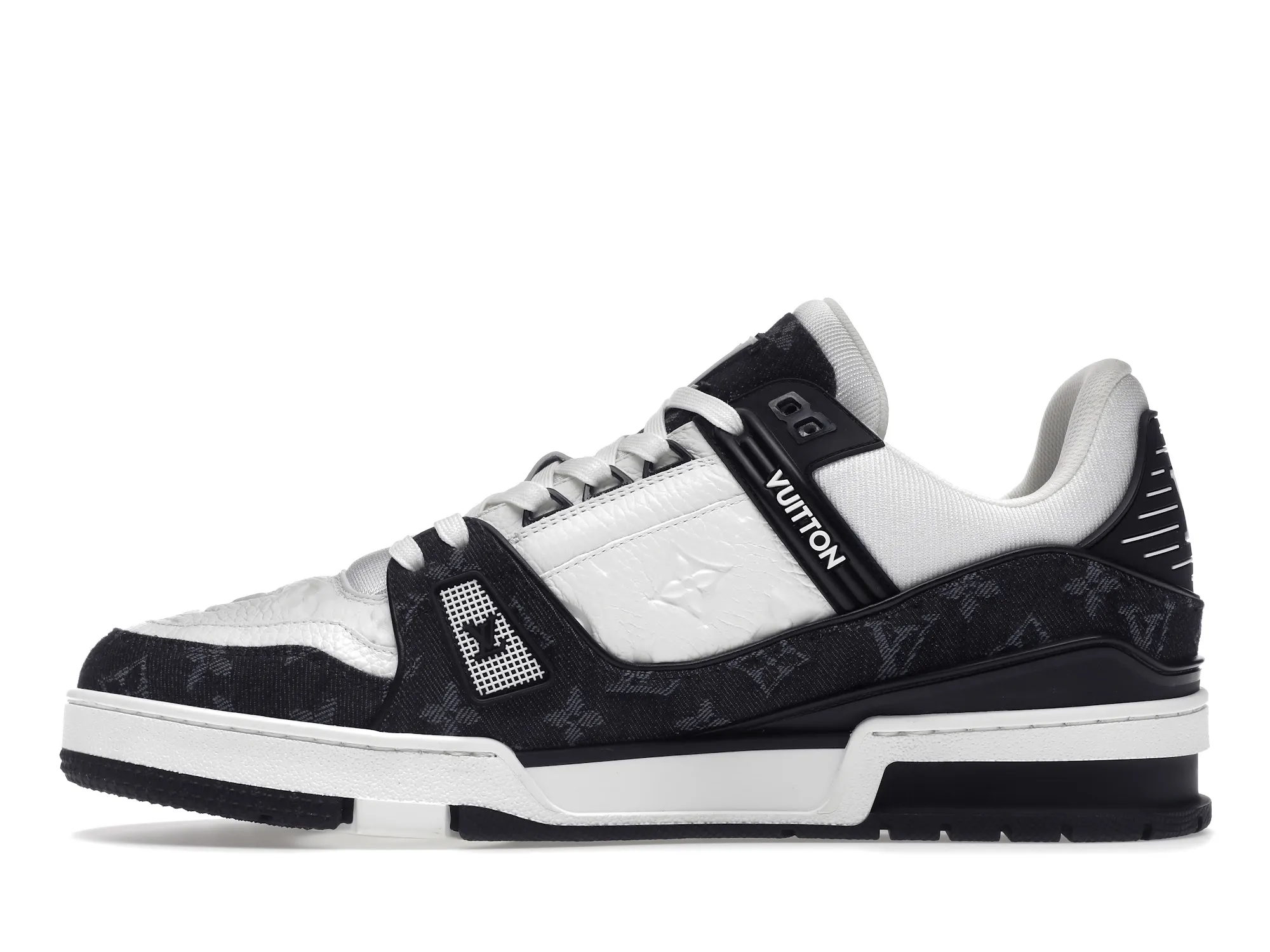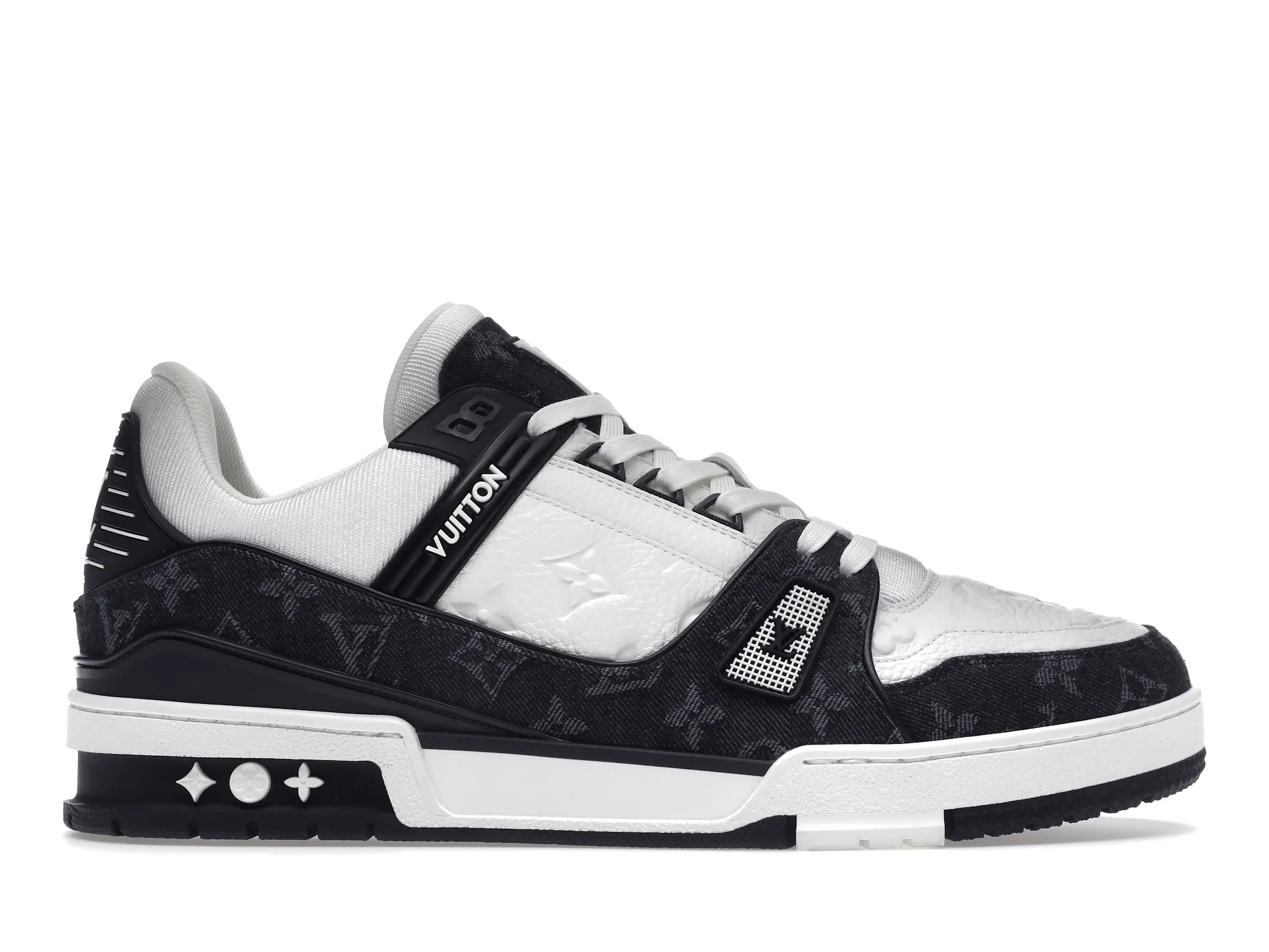 The iconic LV Trainer sneaker has been revisited this season in a combination of Monogram denim and Monogram-embossed grained calf leather. The contrasting colors and materials emphasize the intricate construction of this model, which takes inspiration from vintage basketball sneakers.